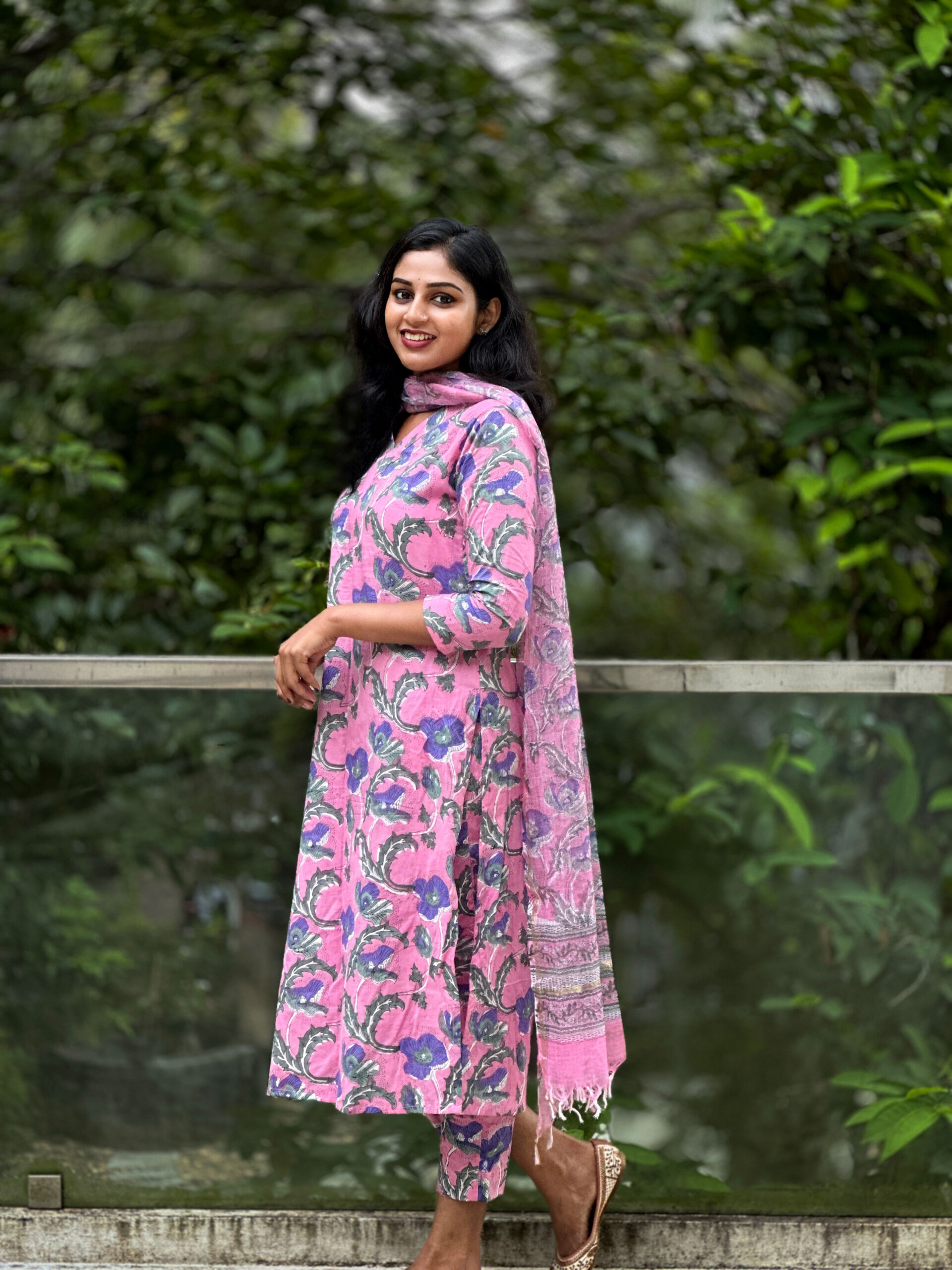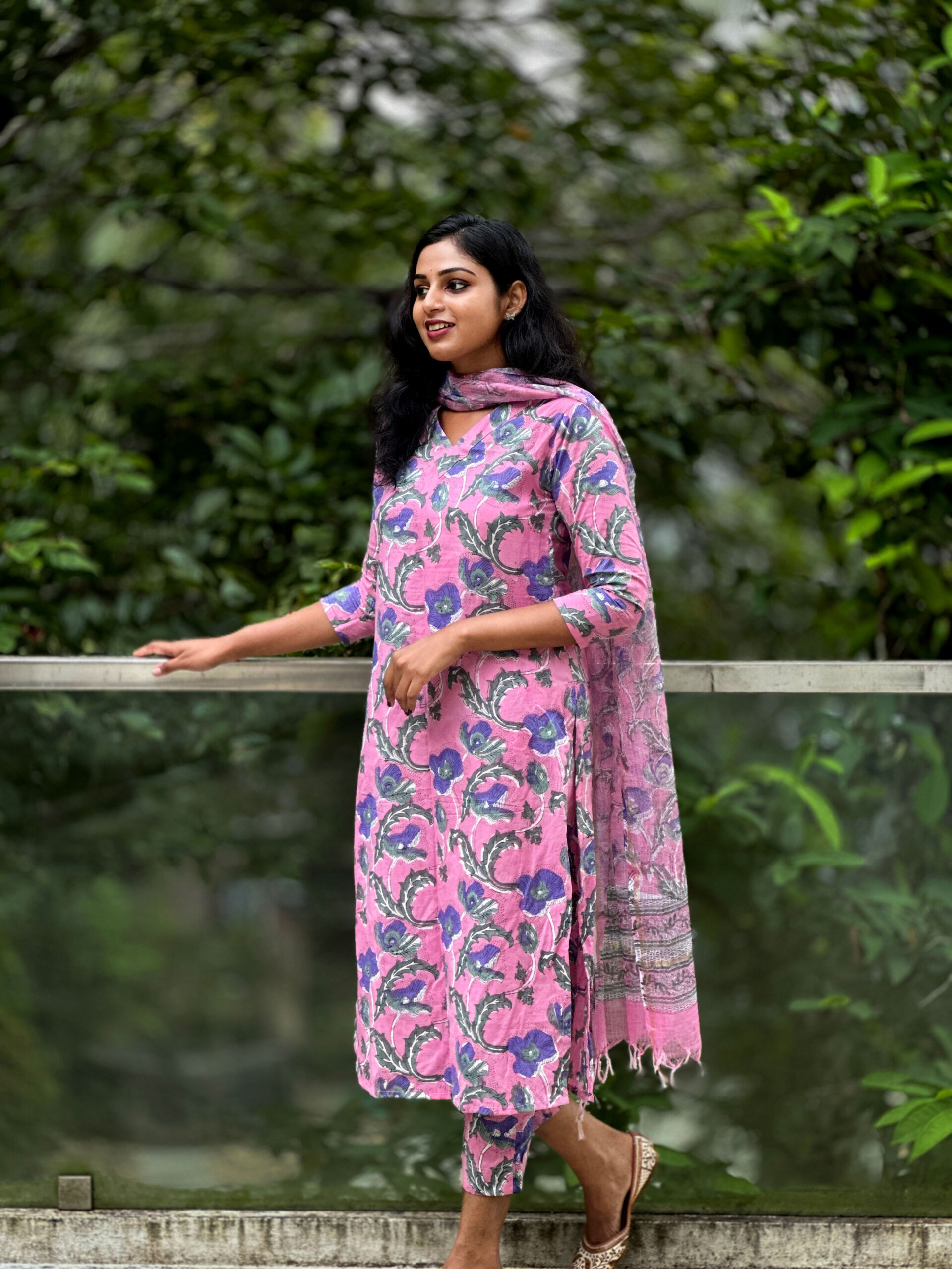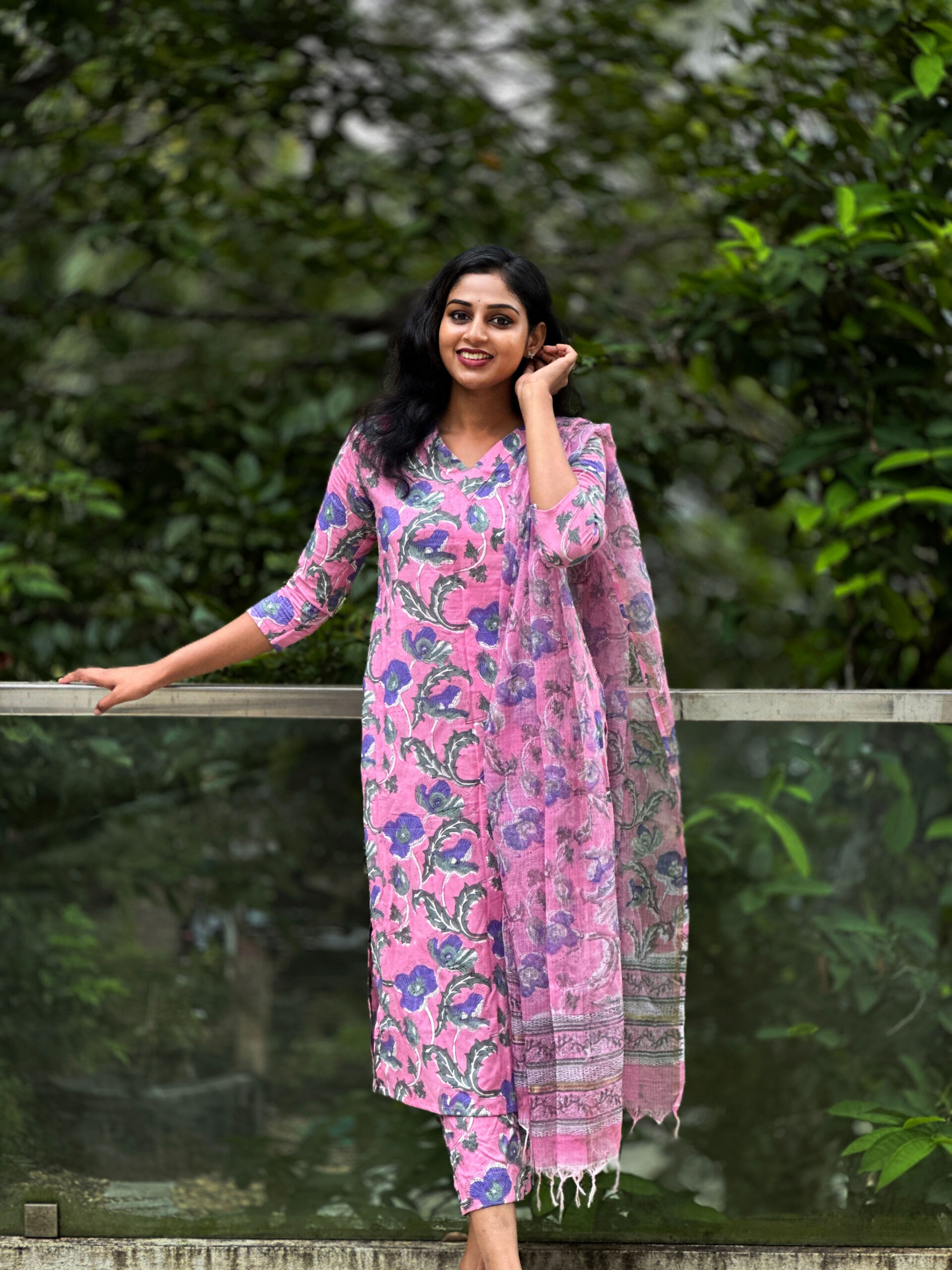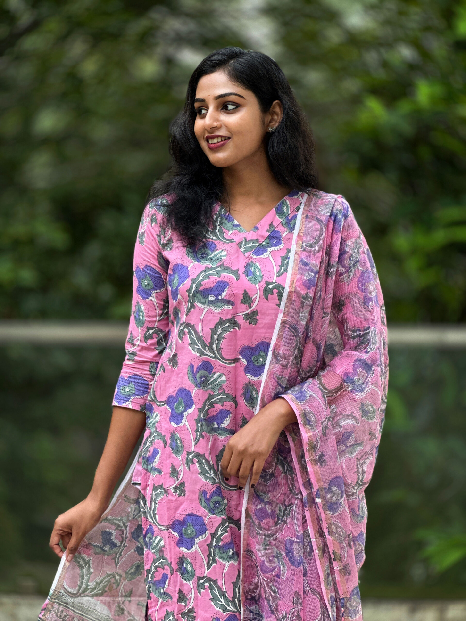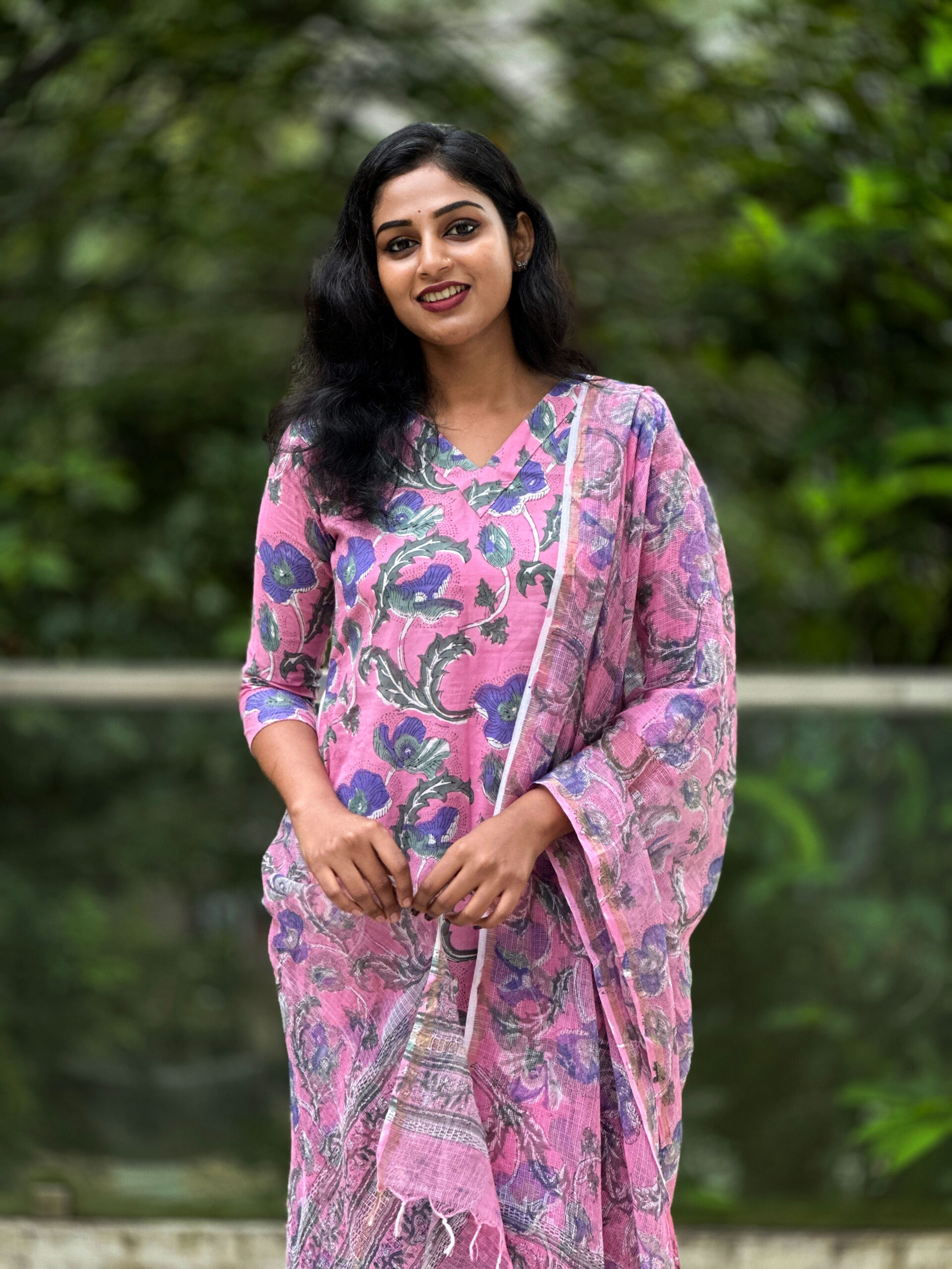 Hand Block Printed Salwar Set With Kota Doria Dupatta